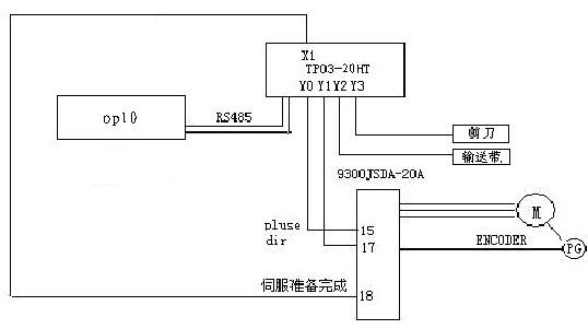 切紙機(jī)械是印刷和包裝行業(yè)常用的設(shè)備之一。切紙機(jī)完成的基本動(dòng)作是把待裁切的材料送到指定位置,然后進(jìn)行裁切。其控制的核心是一個(gè)單軸定位控制。目前國(guó)內(nèi)進(jìn)行切紙?jiān)O(shè)備進(jìn)給定位系統(tǒng)主要有兩種方式,一是利用PLC結(jié)合變頻器實(shí)現(xiàn),一是利用PLC結(jié)合伺服系統(tǒng)實(shí)現(xiàn),從效率上來(lái)說(shuō)伺服相對(duì)變頻器要高很多。這次我們結(jié)合客戶設(shè)備的特點(diǎn)提出了一套方案,文本(OP10)+PLC(TP03-20HT)+伺服(JSDE-20A)進(jìn)行裁切參數(shù)設(shè)定和完成一些手動(dòng)動(dòng)作。