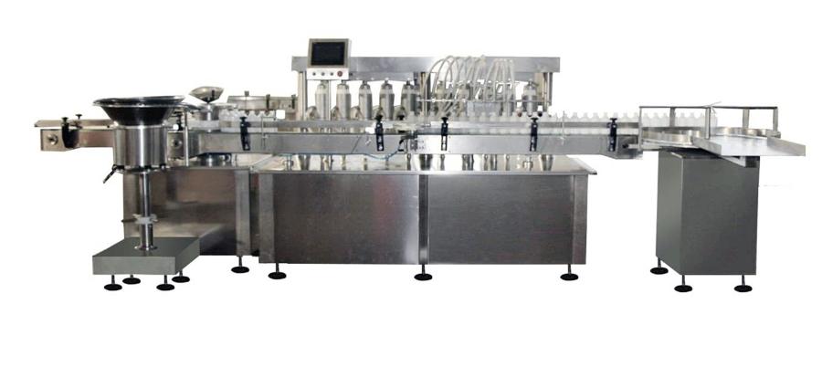 整體流程: 瓶子進入進瓶軌道,由輸送帶輸送到達等分盤。然后瓶子隨等分盤作間歇運動,先在灌裝部位完成灌裝動作;再到達戴膠塞部位戴上膠塞;最后走出等分盤,進入出瓶軌道并送出機器,進入下一道工序。